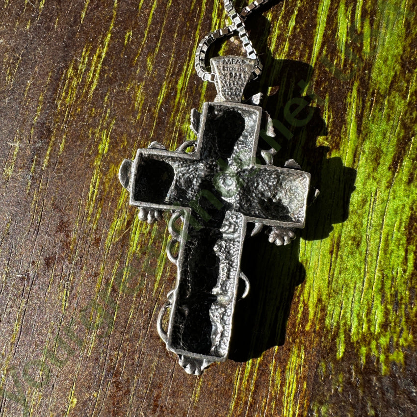 Large sterling silver holy cross pendant and chain necklace. The pendant is cast with grapes and grapevines. It measures 2 1/4" tall. It is a Museum of Fine Arts piece and it is hallmarked as such.