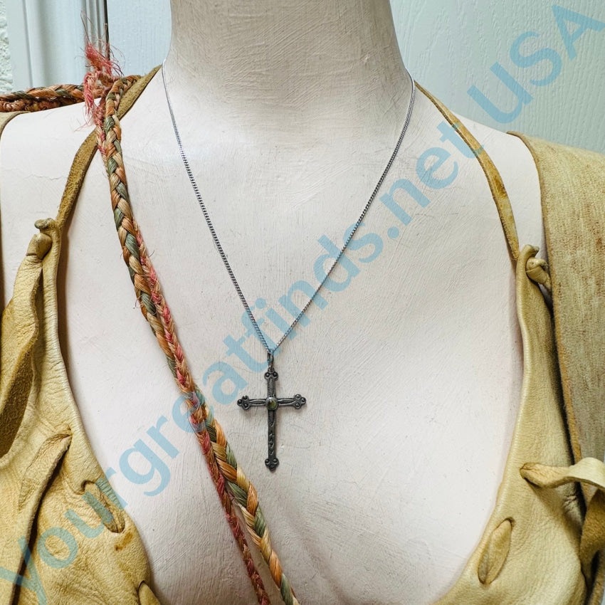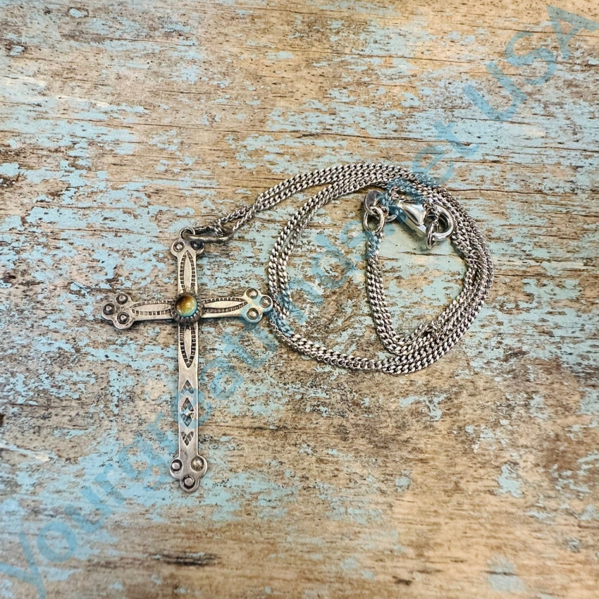 Vintage Navajo Bell Trading Post stamp decorated sterling silver cross necklace. Nice turquoise at the heart of the cross. Has the Bell signpost hallmark. Cross is 1 5/8” tall with the jump ring. The chain is a replacement and measures 18” long. Weight: 4.6 grams. Cross is Fred Harvey era.