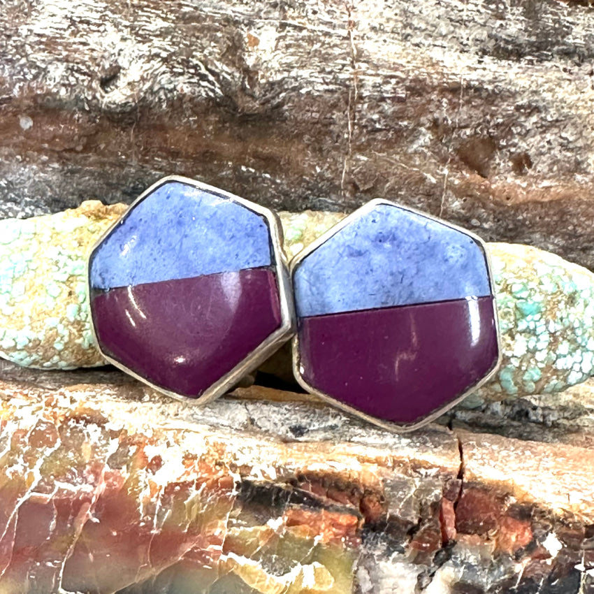 Mexican Sterling Silver clip on earrings set with purple and lavender stones. Might be sugilite for the purple, but might be block stones as well. Made in Taxco. Marked on the back. Almost 5/8” in diameter. Weight: 5.7 grams.