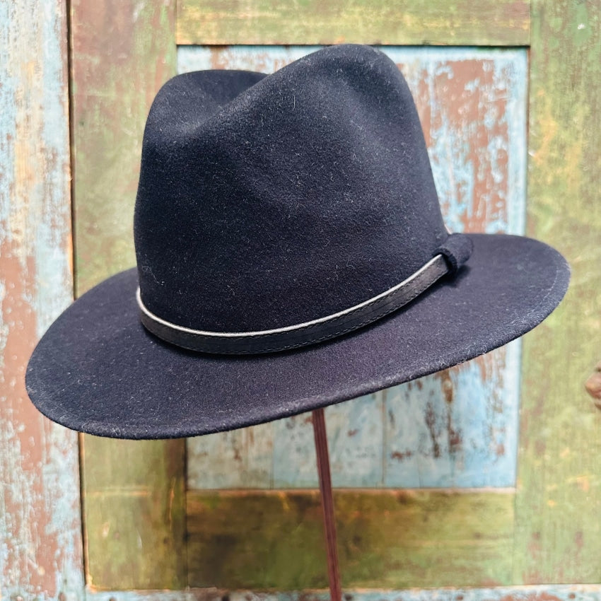 Pre-owned black wool felt fedora hat by Bailey (A Bollman Hat Company) Marked a medium and measures 23 1/2” around the crown. Brim is 2 1/2”. Great condition.