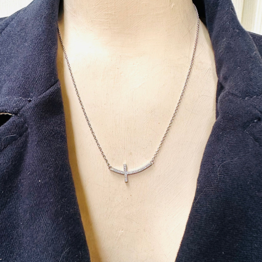 Sterling silver & white cubic zirconia arched cross necklace. It is 18: long. Marked EW 925. Weight: 3.3 grams.