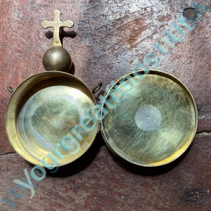 Antique gold over sterling silver Catholic reliquary. Has two rings for a chain and an orb and cross crown. Traditional engraving on the front and monogram on the back. Hinged lid. Interior is empty and clean. Silver has a warm patina. I did acid test it. Diameter is 42mm and it is 3" tall. Weight: 29.4 grams. Rare piece.