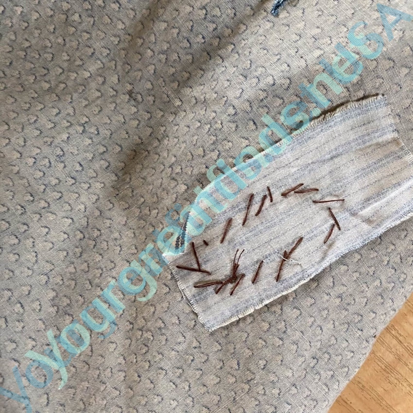 Vintage, not antique indigo blue cotton calico apron. This was made in the 1980s to be displayed on a peg rack. It has intentional holes to make it look antique and one is patched with ticking. It is 32" long and in great condition. 40 years old.