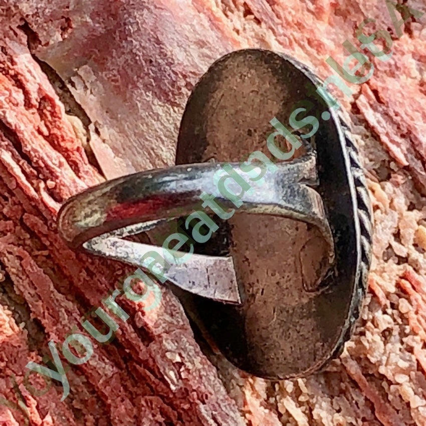 Ring is a size 5 and the face of the ring measures 7/8" long. The dome of the stone is 5mm tall. Weight: 8.1 grams. Silver is very tarnished.