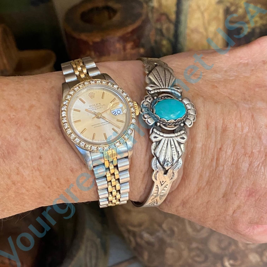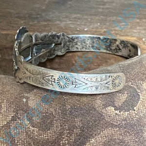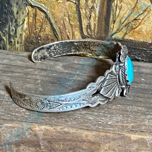 Vintage time worn sterling silver Navajo “Pretty Girl” bracelet. It is set with beautiful turquoise that is likely from the Cerrillos Tiffany mine. It is stamp decorated to the terminal tips and has applied fans. This piece has smooth wear from many years of being worn. Interior measures 5 1/8” plus the opening of 1 1/4”. 7/8” wide. Will fit a wrist that measures 6 3/8” Weight: 16 grams. Marked sterling. Tarnished inside.