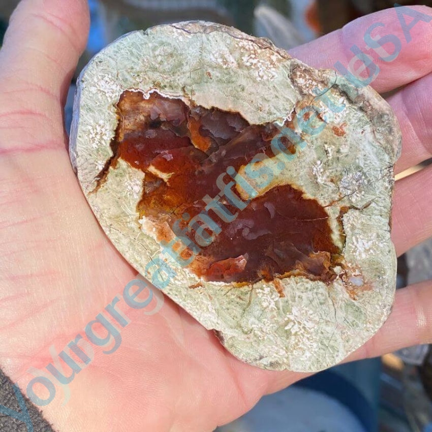 Estate found geode-cut agate with polished cut. It measures 3 3/8" by 2 1/2" by 7/8". Weight: 151.7 grams.