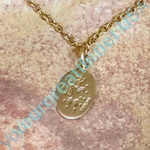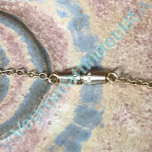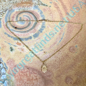 Vintage gold over sterling silver Catholic baby necklace with Miraculous Mary. Has a barrel clasp. Necklace is 12" long. The pendant is 11mm tall. Marked sterling. Chain is not marked with metal purity and may be gold tone. Clasp does not tighten all the way but is tight. Weight: 2.6 grams.