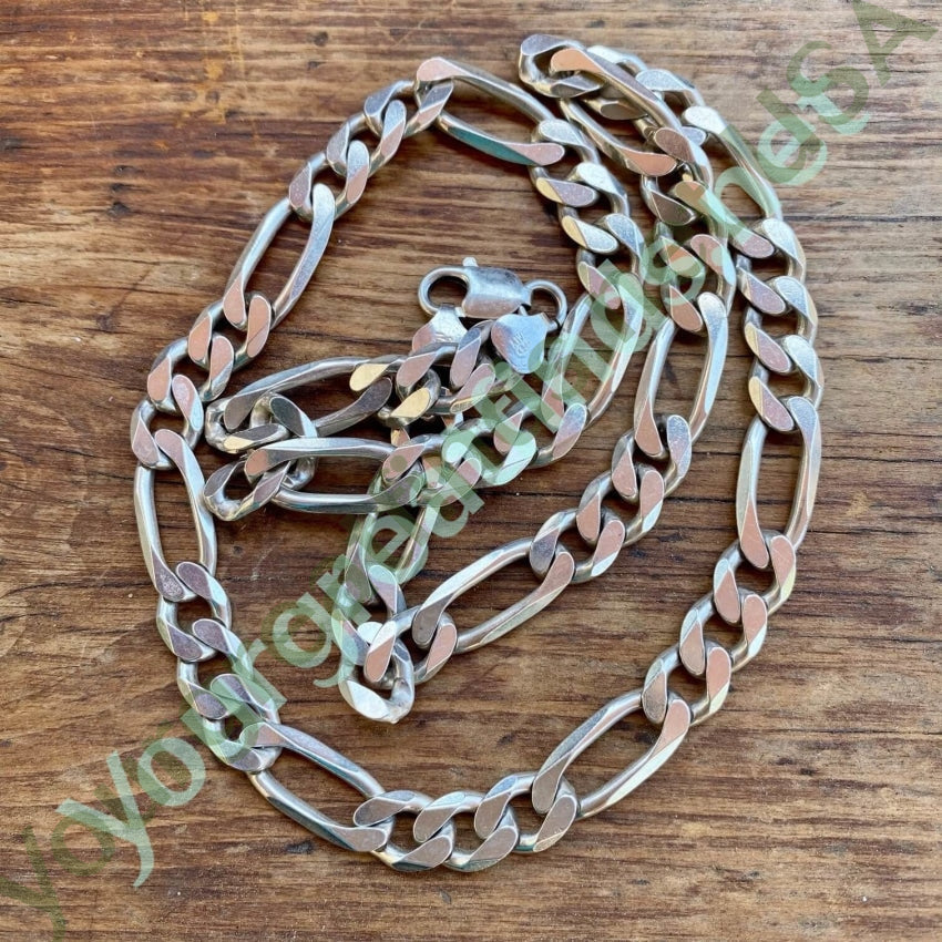 Heavy solid sterling silver figaro chain that is 24: long. Weight 73 grams. Strong lobster claw clasp. 3/8" wide. Hallmarked on clasp.