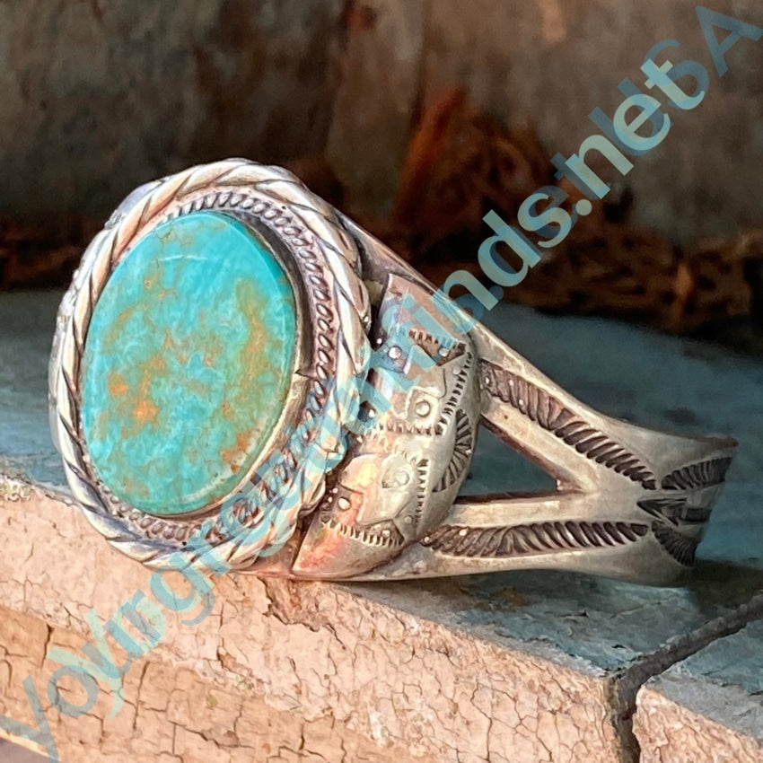 Old Navajo cuff bracelet from the Fred Harvey era. This piece is wrought silver and has tool and flow marks inside. Stamp decorated and has arrows. Stamped fans on the side of the almost round stone. The turquoise may be Royston mine. It has deep teal with rust matrix.
