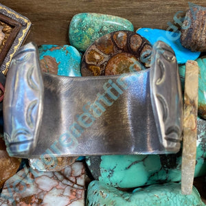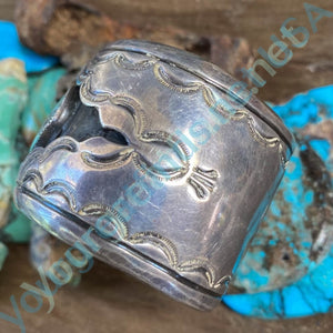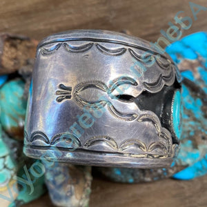 Beautiful vintage Navajo sterling silver shadowbox bracelet. The shadow box opening is scalloped and stamp decorated giving it a lacy look. The turquoise stone is from the Morenci mine; blue with large pyrite inclusions. The silver has a warm patina from age. Interior measures 5 3/8" plus the opening of 1 3/8". For a wrist that measures 6 3/4" and possibly 7". It is not adjustable. It is 1 1/2" wide. Weight: 79.8 grams.