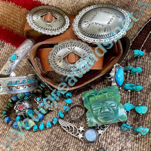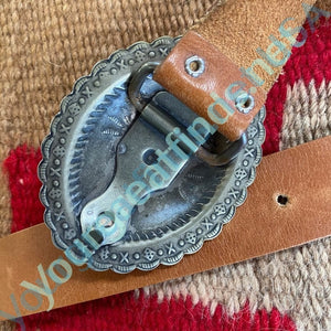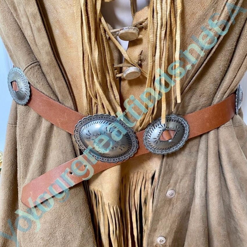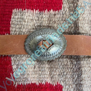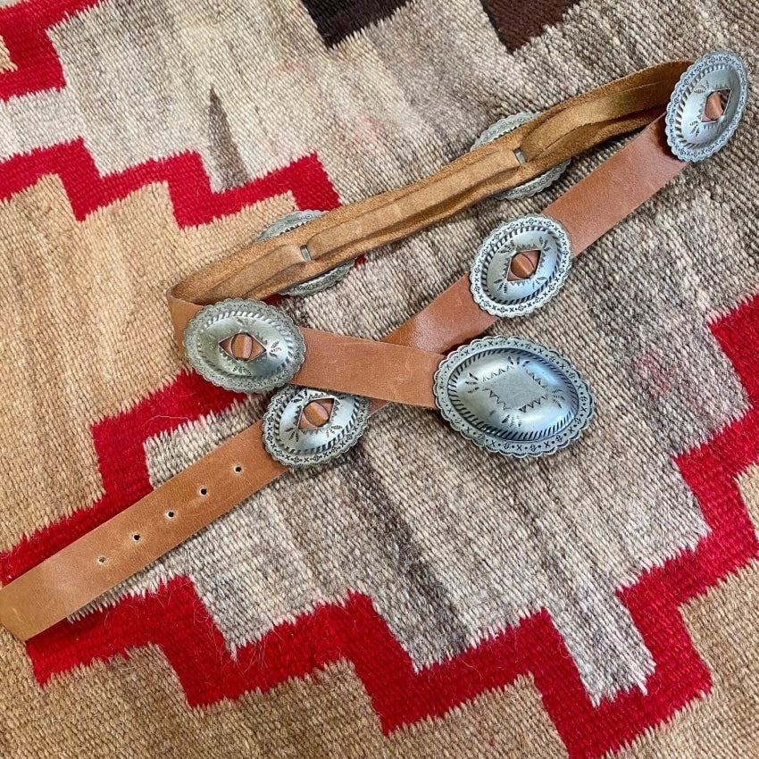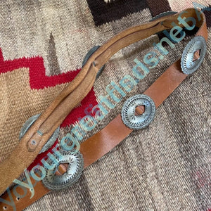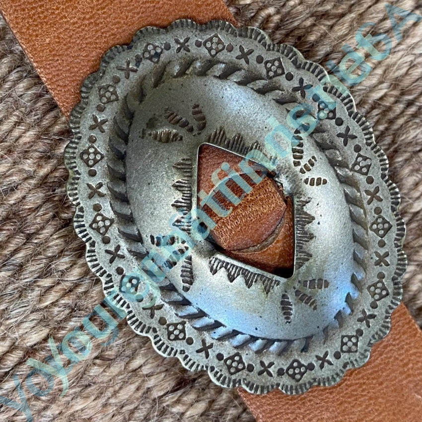 Old West nickel silver concho belt (Costume Grade) on soft brown leather. It is made the old with cut-outs in the center of the conchos and two pieces of leather. It is 36 1/2" long and the holes fit a wait that measures 30 1/2" to 33 1/2". The leather is in great, soft condition. Belt is 1" wie. The conchos measure 2" by 1 3/4". In great vintage condition.