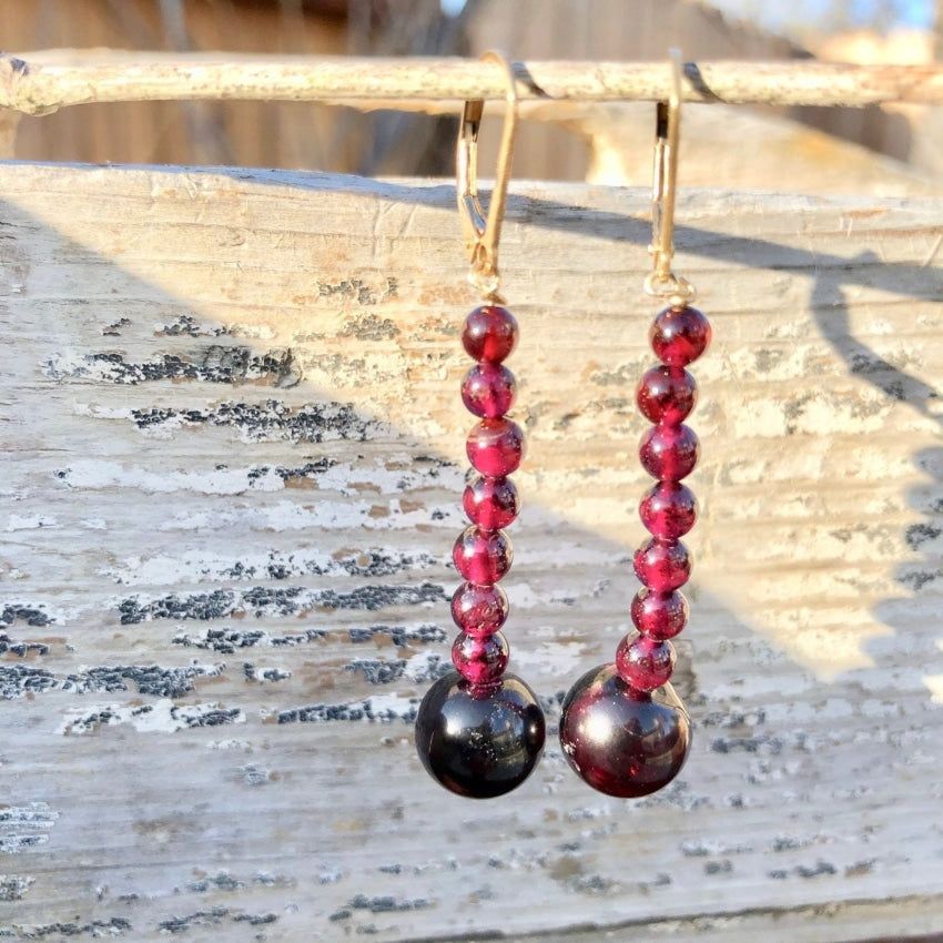 Vintage genuine red garnet beaded earrings with 14k gold filled French lever back ear wires. They are 2" long and weigh 7.4 grams together.