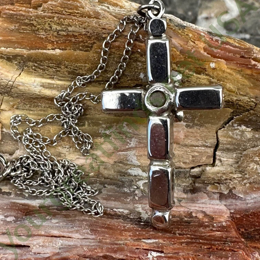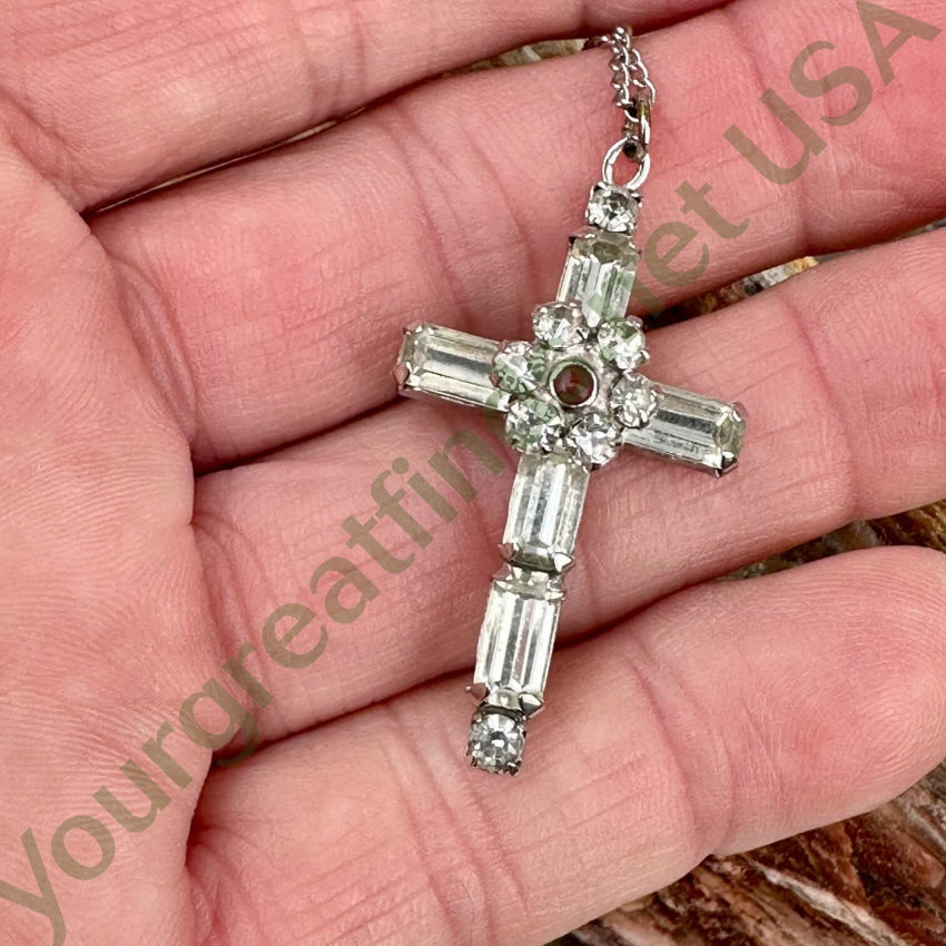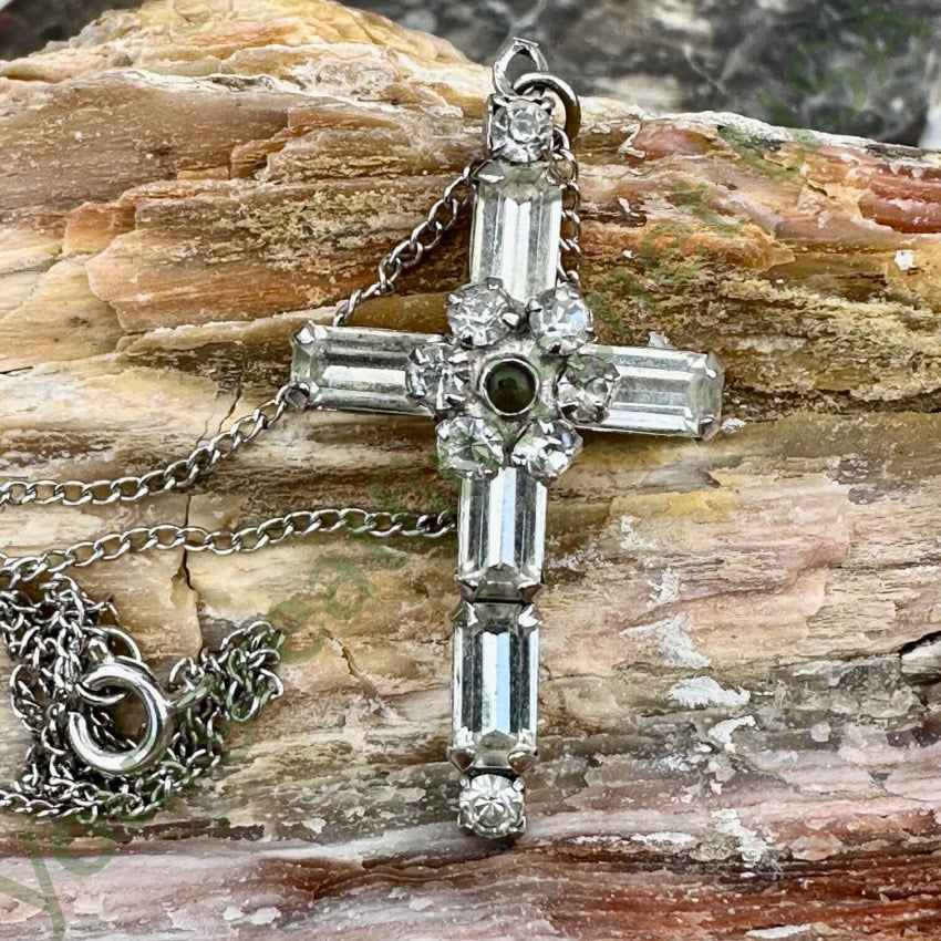 Vintage silver (not sterling) rhinestone paste necklace. The cross is a stanhope with a viewfinder at the center that shows you a miniature version of the Lord's prayer. Cross is 1 1/2" tall and the chain is 14" lng. Weight: 4.6 grams.