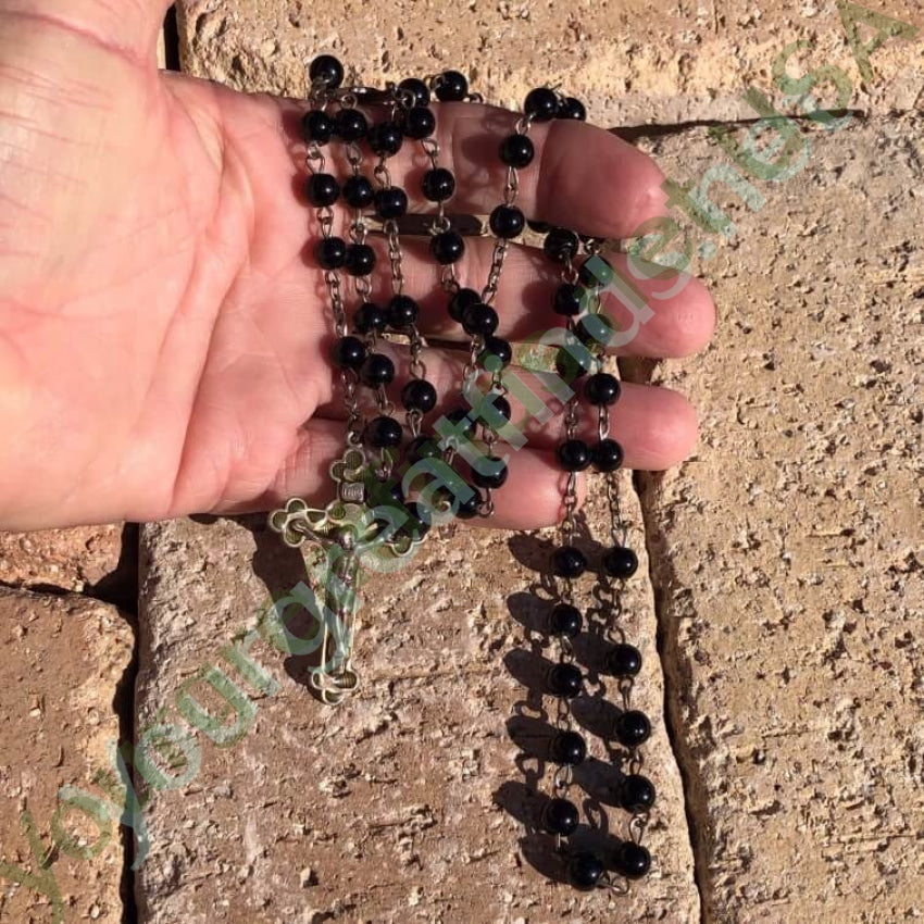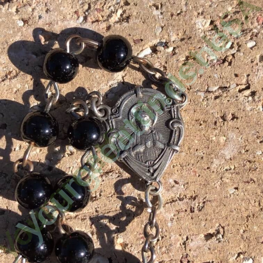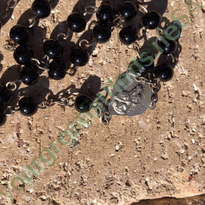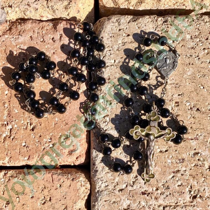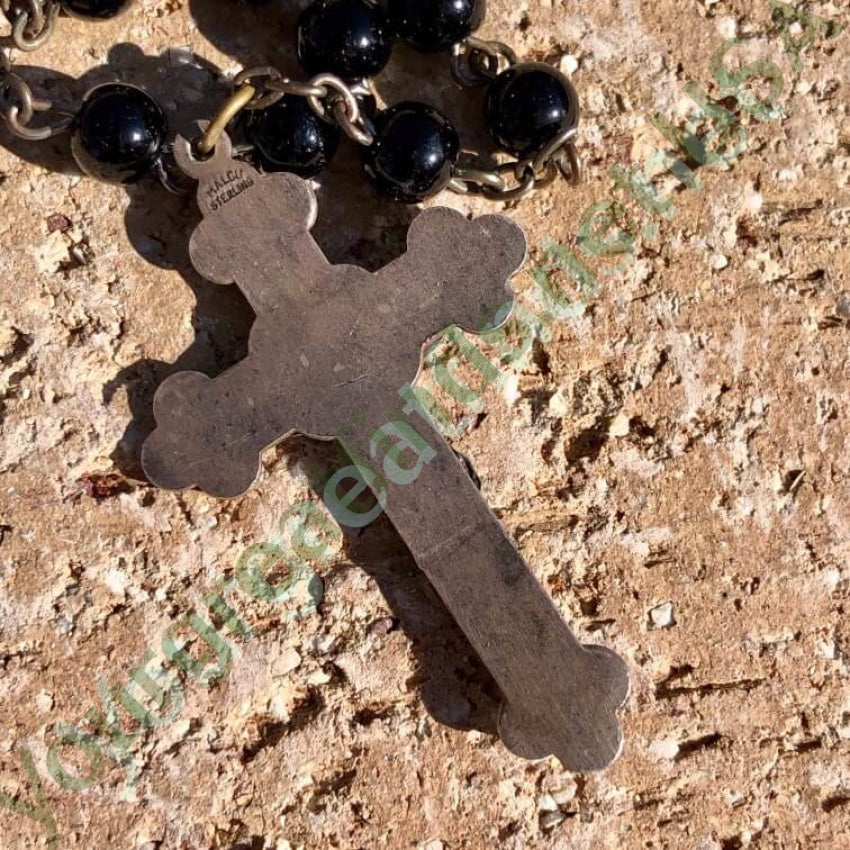 Vintage sterling silver Catholic rosary with shiny jet black glass beads. It is hallmarked sterling, Malcu and Excel. Crucifix is 1 7/8" tall. It has pale gold guilloche enamel. Rosary opening is 27". Weight: 31.4 grams
