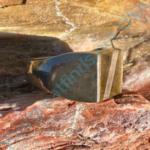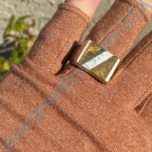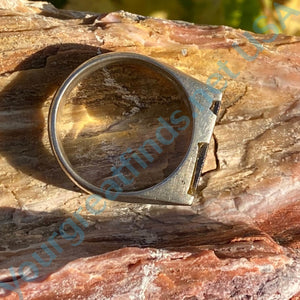 Vintage sterling silver ring made in Mexico. It is inlay set with golden tiger’s eye. Size 10 and the face measures 17mm by 12mm Hallmarked inside. Weight: 14 grams.