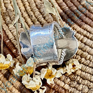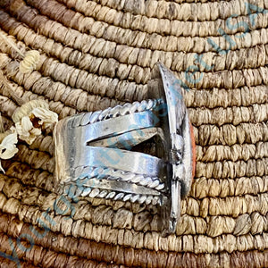 Old time worn smooth Navajo one feather ring set with a deep red coral stone. Decorated with applied swirls, rating drops, twisted rope, and a single feather. The feather has a dent and is worn so smooth that the stamping is missing in some areas. The sawtooth bezel has smooth wear as well. Wide shank is edged in rope and cold chisel split. Size 6.5 Face is 1 1/4” long. Weight: 10.8 grams. No hallmarks. Acid tested sterling silver or higher.