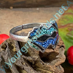 Tiny vintage sterling silver ring with green and blue chip mosaic inlay. The ring was made in Taxco, Mexico and has a split shank to make it adjustable. Right now it is a size 5. Measures 10mm wide. Tarnished. Hallmarked inside.