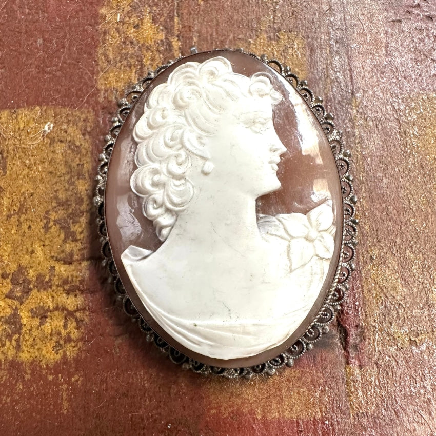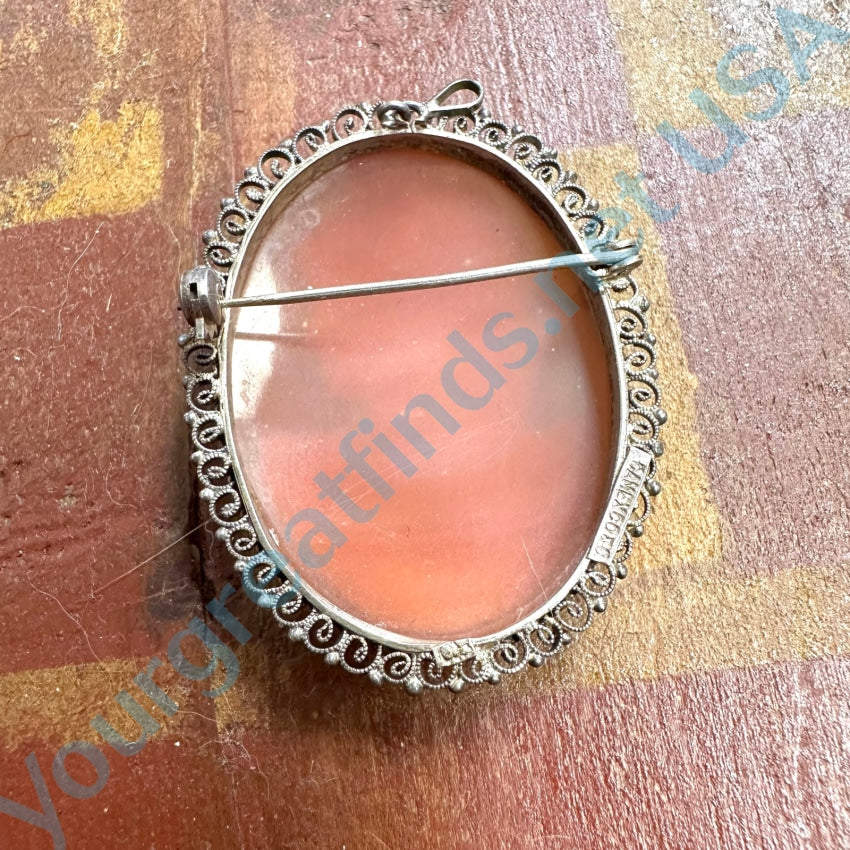 Vintage 800 silver filigree pendant pin set with a hand carved Italian shell cameo. Has a bail for a chain and a locking clasp pin. Measures 1 3/4” by 1 3/8”. Marked Camexico & Co. on the back. Weight: 10.4 grams. Marked 800.