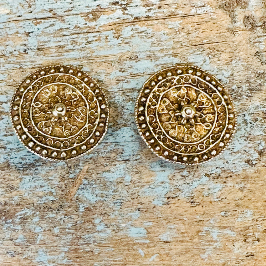 Vintage gold over sterling silver medallion earrings made in Italy. They are1” in diameter. Hallmarked on the back. Clips work well. Weight: 12.3 grams.