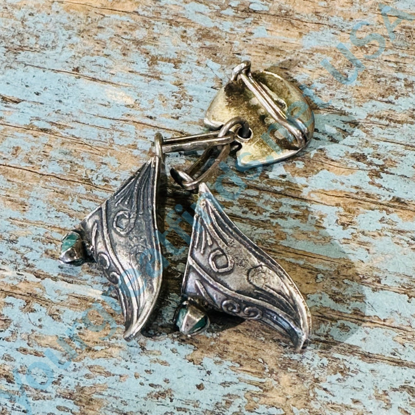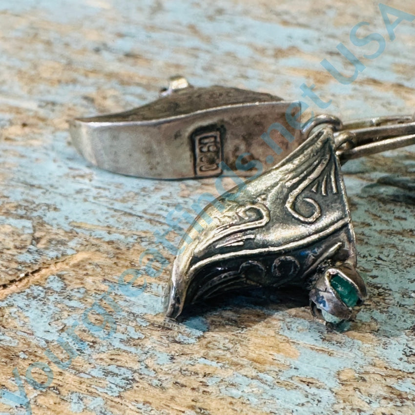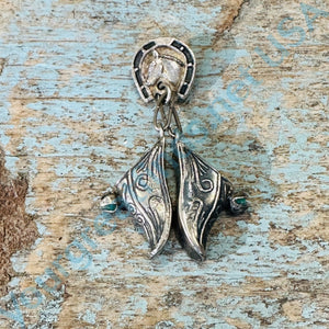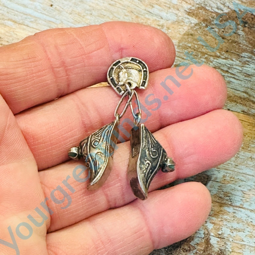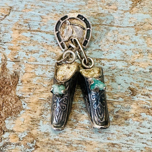 Vintage 900 silver charm pin. The pin has a classic horse head in a horseshoe and it has a tiny pair of shoes for charms. They look like tooled leather and they are prong set with green chrysoprase nuggets. The pin is 1 3/4” long. Weight: 4.5 grams. Marked 0900 for the metal purity. tarnished.