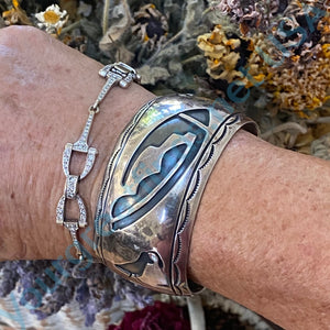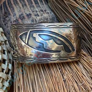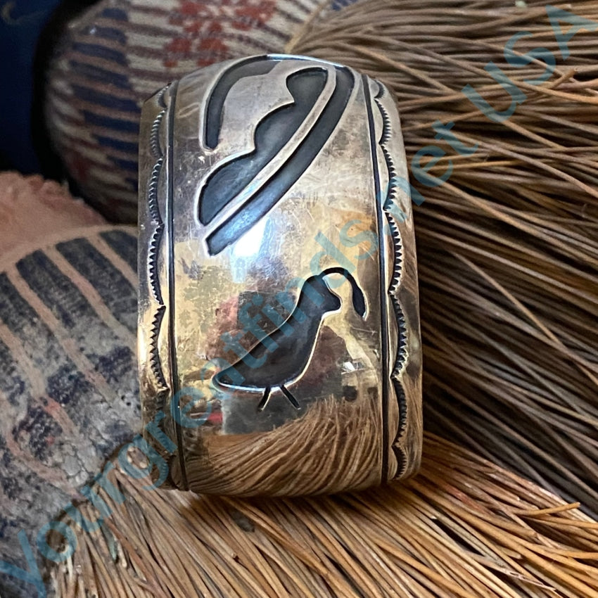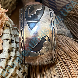 Vintage Native American sterling silver wide cuff bracelet. The design was done with the overlay technique and has a traditional design and has quail on the sides, a design that I rarely see. Stamp decorated along the edges.