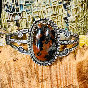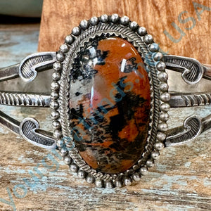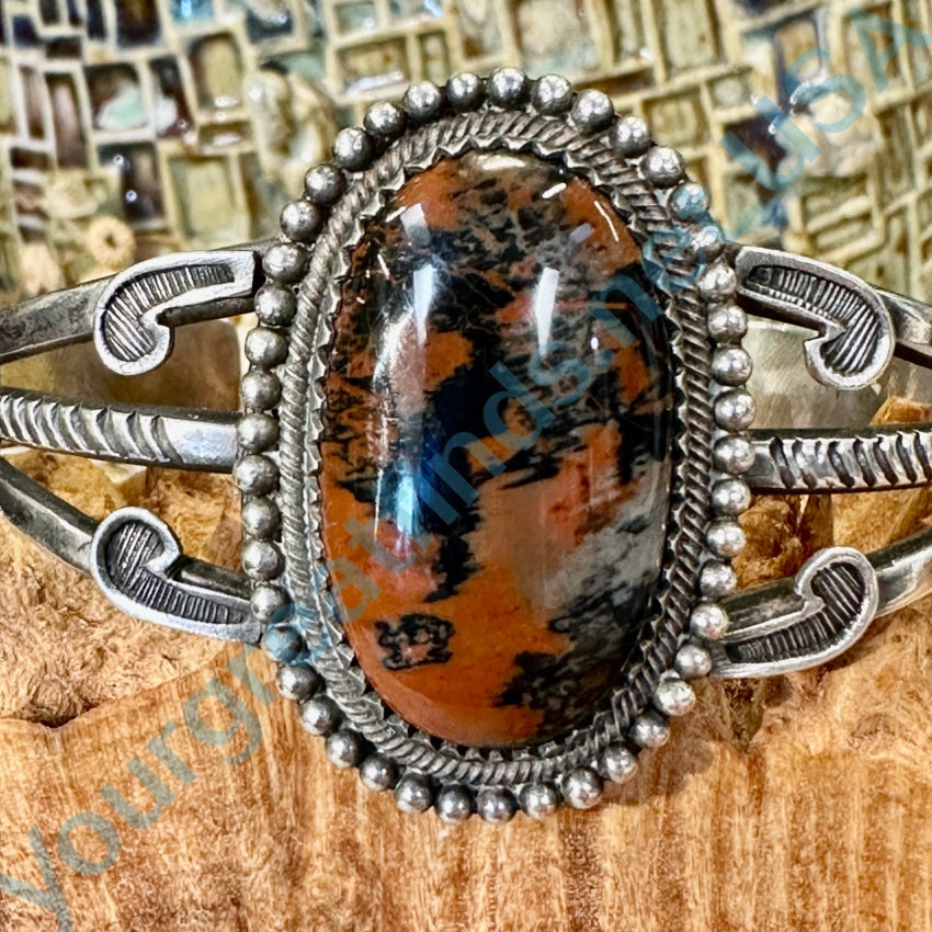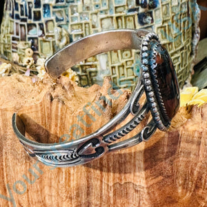 Vintage Navajo sterling silver bracelet set with red and black petrified wood. It is stamp decorated and has some appliqué work. Nice file marks inside. Interior measures 5 1/2” plus the opening of 1”. It is 1 3/8” wide. Fred Harvey era.