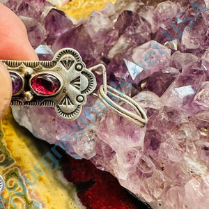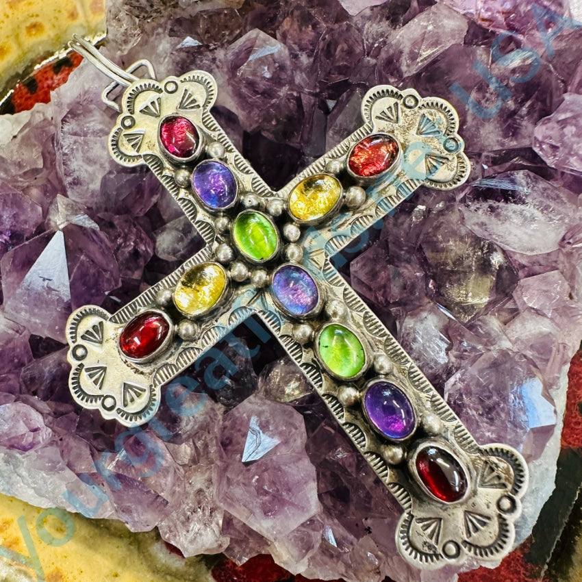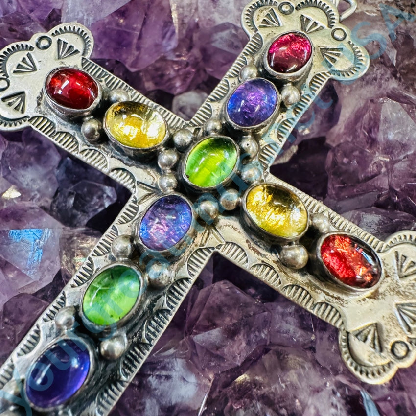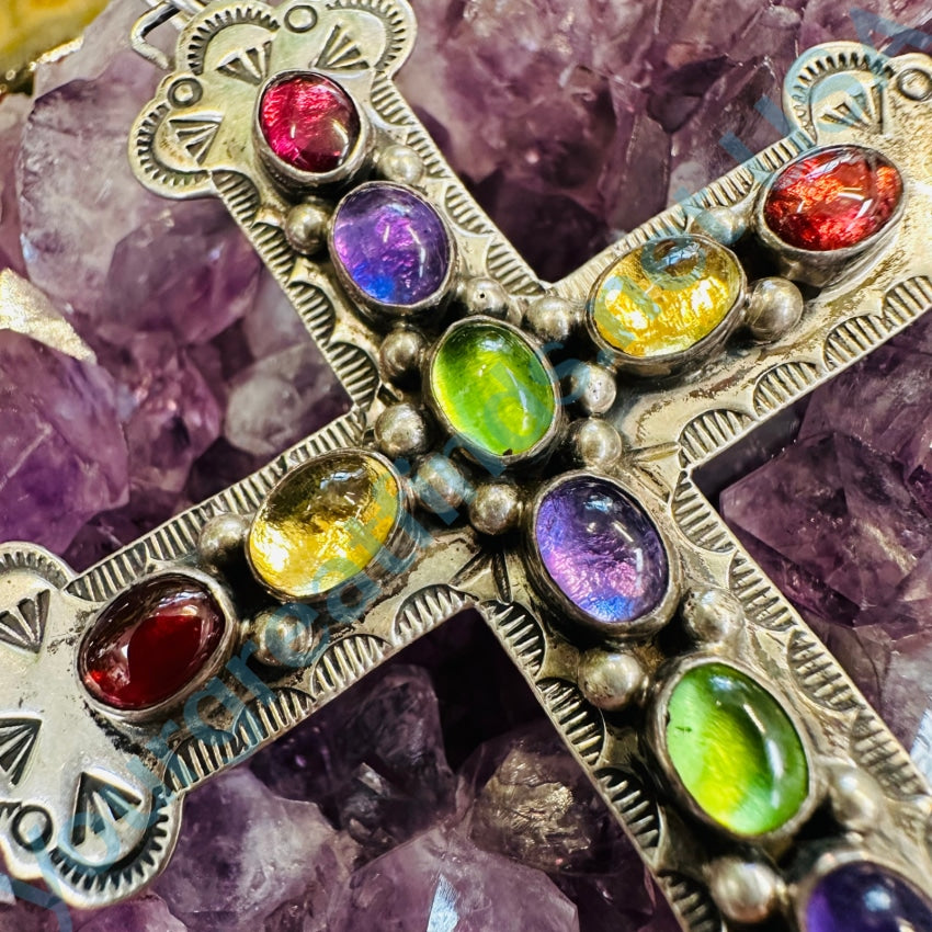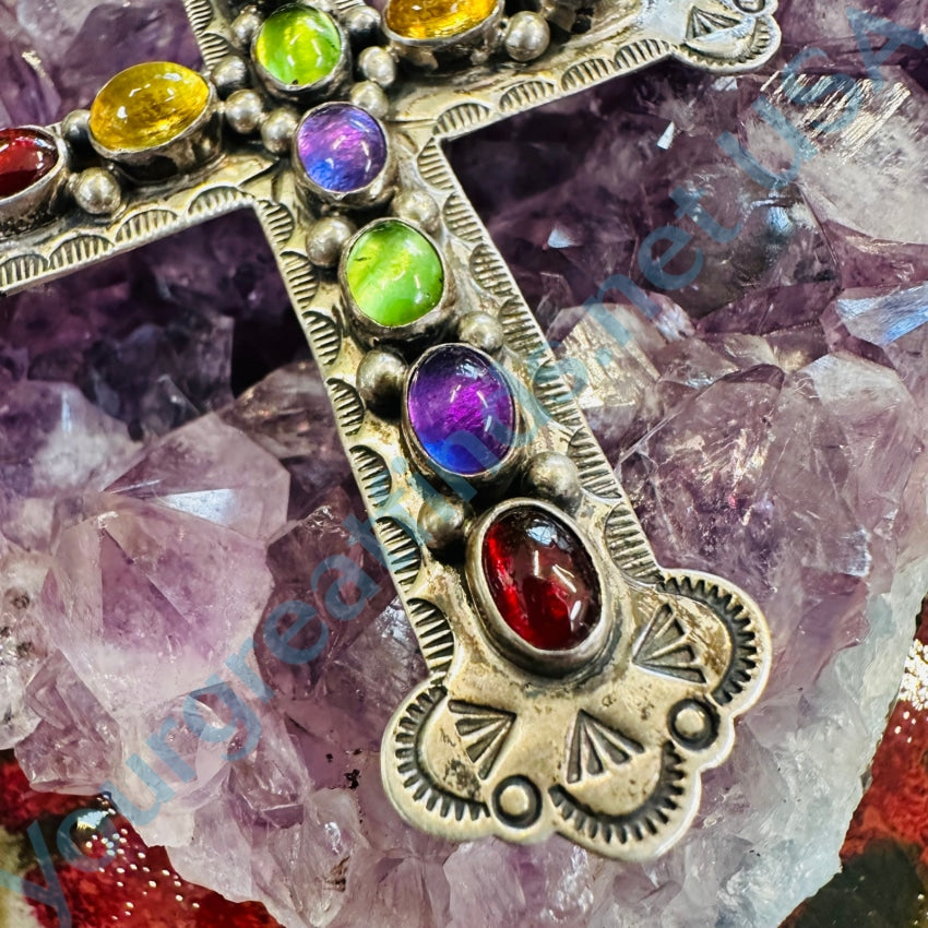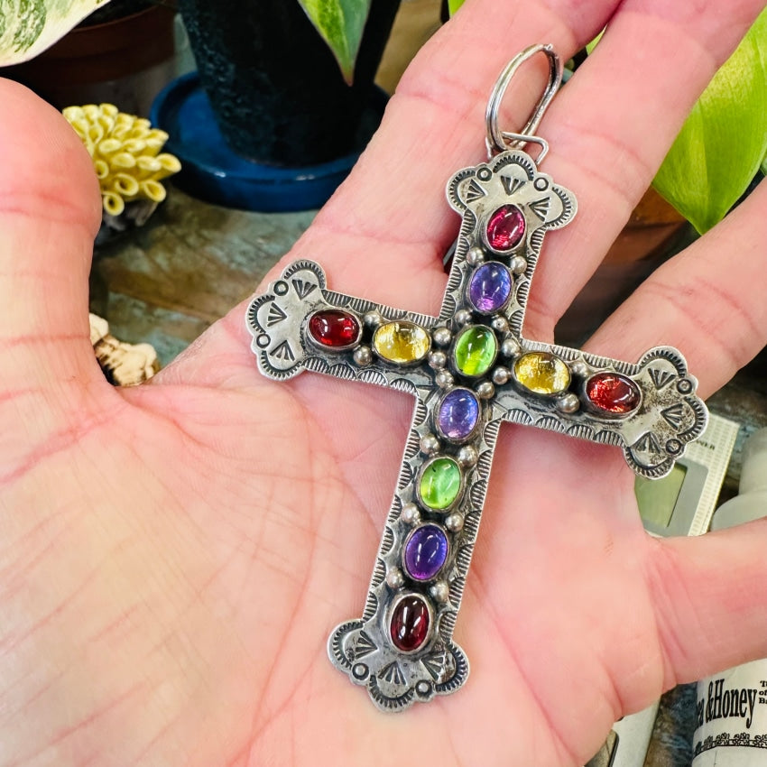 Vintage Navajo sterling silver Holy Cross pendant. it is well stamp decorated and set with garnets, amethyst parison and citrine. Made and hallam asked by Henry Yazzie. It is 3” tall. The jump ring appears to be a replacement, I wonder if it had a wide enhancer bail at one time.  at his should’ve be replaces as it hangs a little off. Weight: 20.2 grams.
