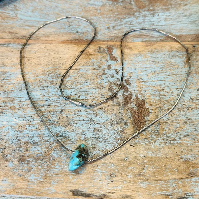 Vintage Southwestern sterling silver (Liquid silver) tube bead necklace. It has a pendant of a large turquoise nugget stone. It is 23” long. The stone is 5/8” long an d is somewhat heart shaped. Weight: 8 grams. Some tarnish. barrel clasp is not sterling.