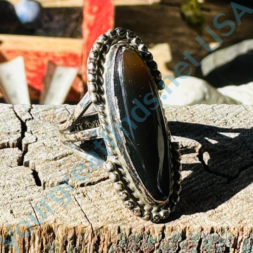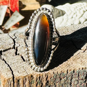 Vintage Navajo Sterling Silver ring set with root beer agate that is deep dark brown with a light tip at one end. The ring is tarnished and left in original patina. It will polish up if you want to polish it.