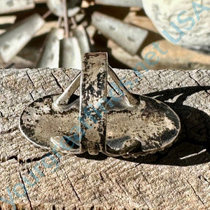 Size 6 and the face measures1 1/4” long Weight: 6.9 grams. Marked sterling inside. Shank is cold chisel split.