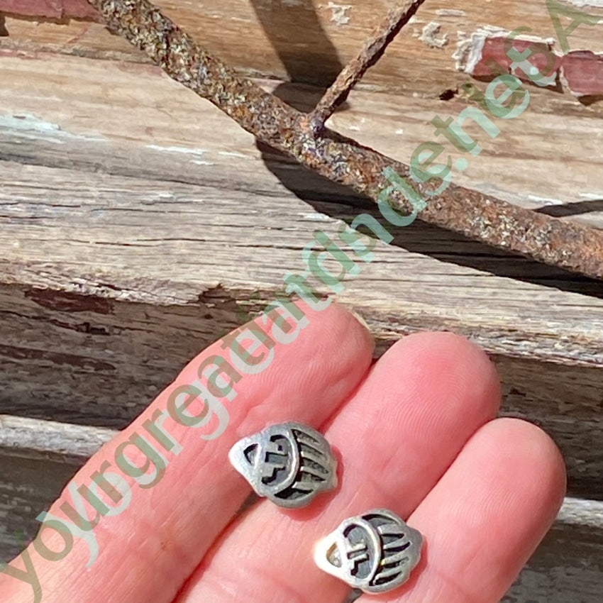 Vintage sterling silver stud pierced earring by Hopi artist Jay Honyaktewa. They are in the design of bear tracks and the design was done with the overlay technique. They measure 5/8” long. Together they weigh: 2.8 grams. Hallmarked on the back.