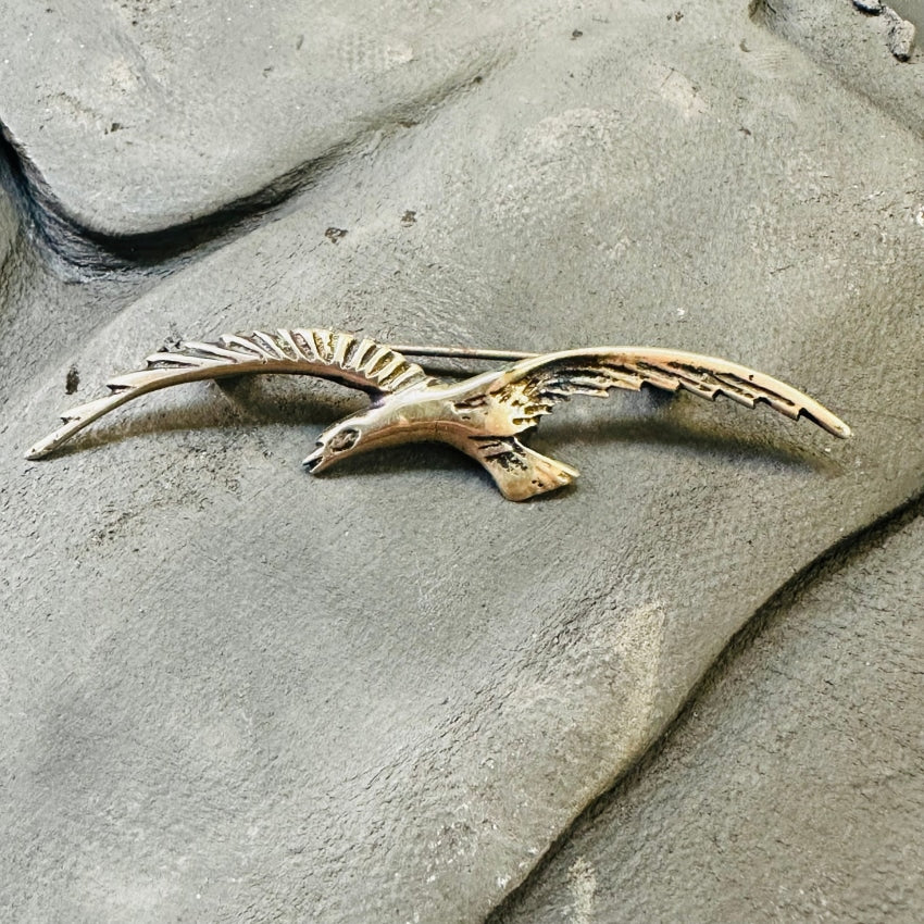 Vintage sterling silver bird in flight pin made in Mexico. It has a wing span of 2 1/2”. Hallmarked on the back. 1930s. Non-locking clasp. Weight: 3.5 grams.