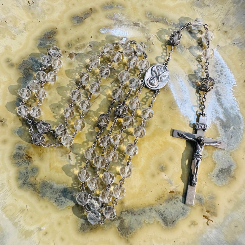Vintage Sterling Silver Clear Glass Crystal Bead Rosary
