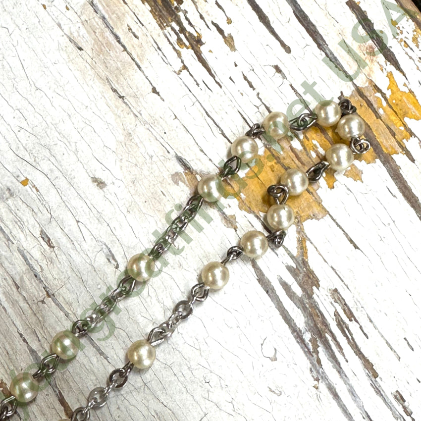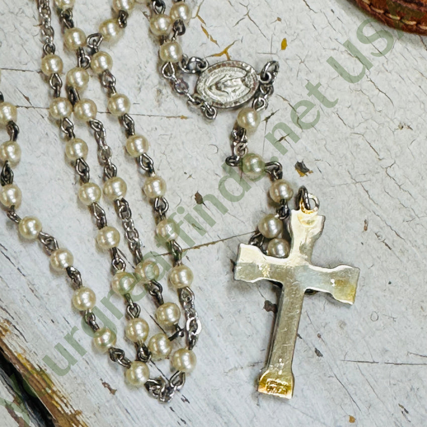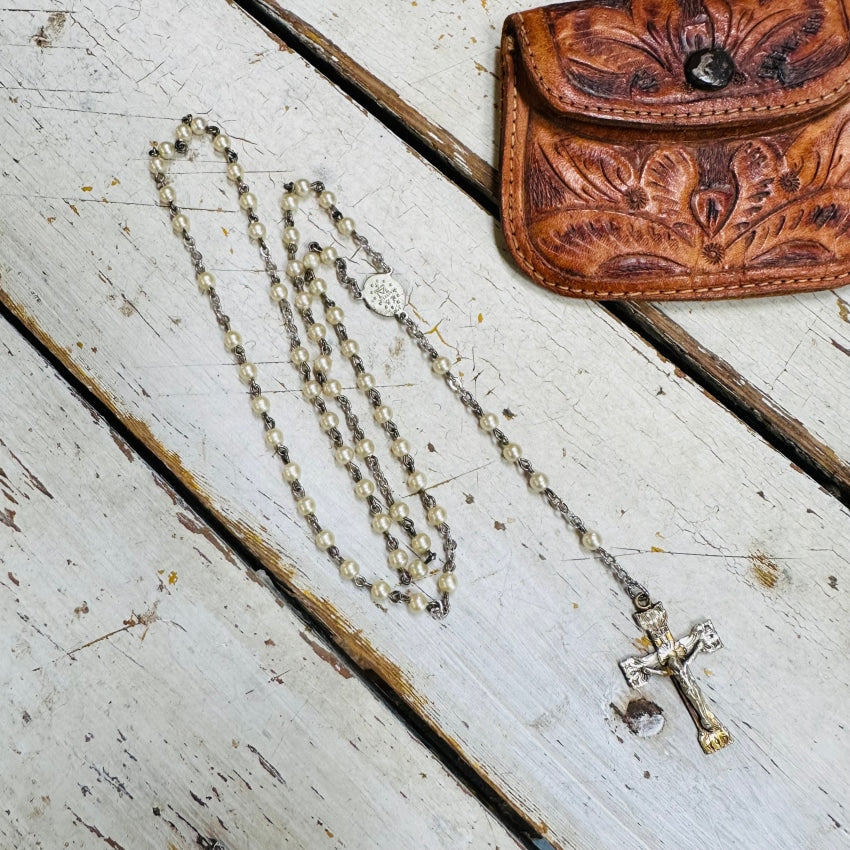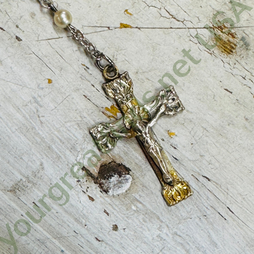 Vintage sterling silver rosary with faux (plastic) pearls. The crucifix is marked sterling. Opening is 20”. Weight: 8.9 grams.