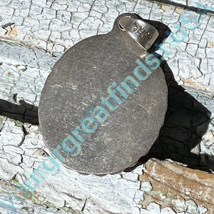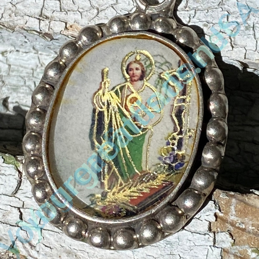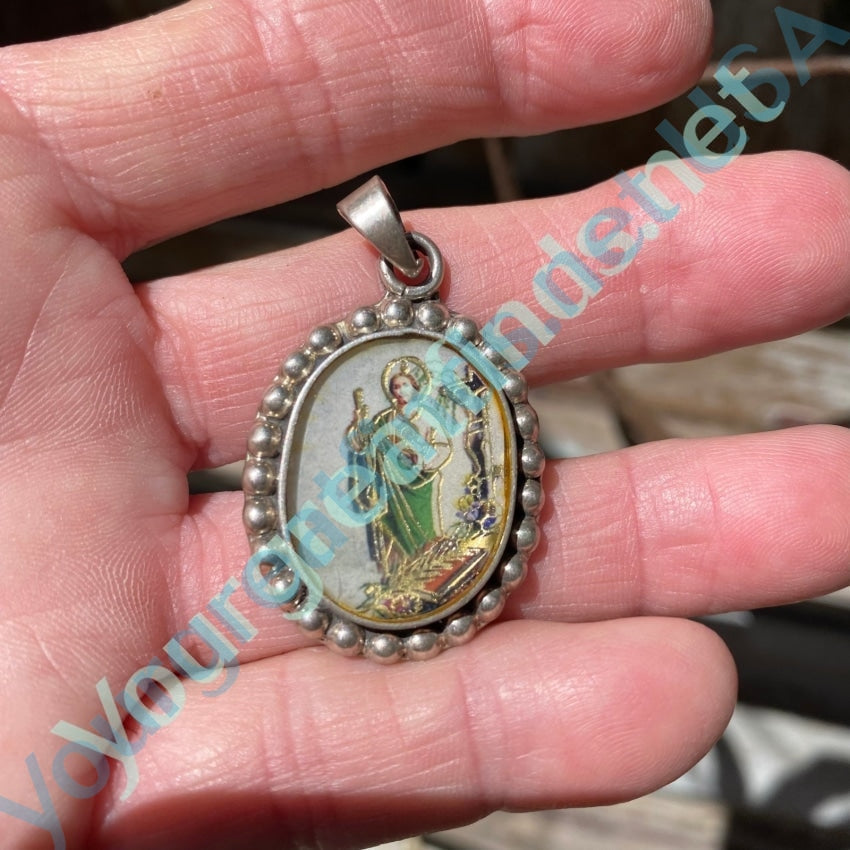 Vintage sterling silver pendant with a print of Jesus that is hand gilt painted with outlines. The setting is framed with raindrops. Made in Mexico and stamped on the bail. Measures 1 5/8” tall with the bail and 1” wide. The image is behind thick glass. Weight: 8.8 grams.