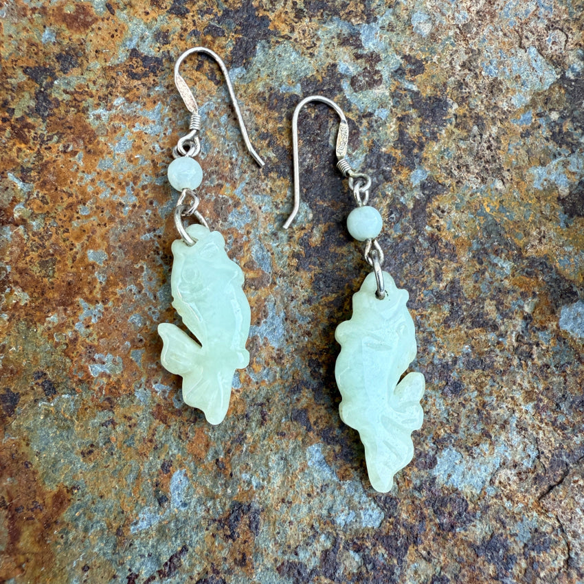 Vintage sterling silver pierced earrings. Each earring has a jade bead and the drops are hand carved pale green jade in the shape of a fish. Earrings are 2" long. Weight together is 4.7 grams.