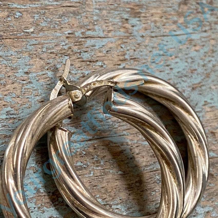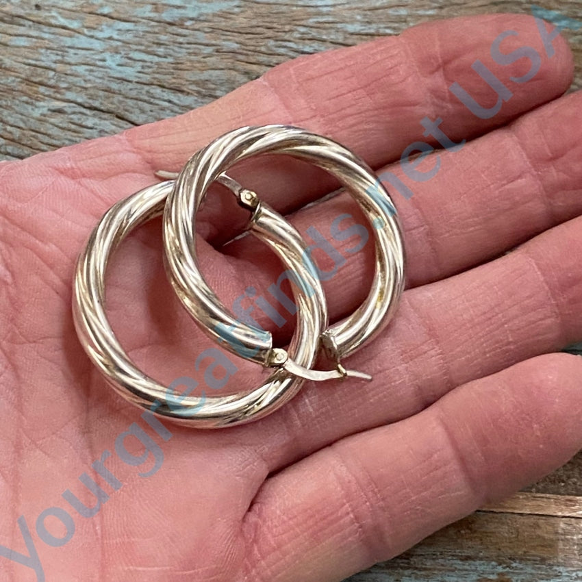 Vintage sterling silver hoop earrings made in Italy. They have a twisty texture and are hollow inside. Measure a diameter of 1 1/4". 4.5mm wide. Weight: 8.3 grams. Marked 925.
