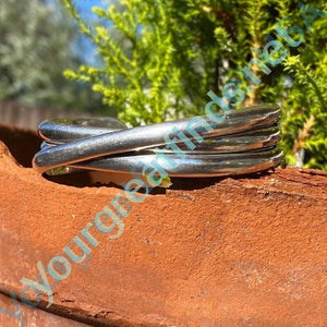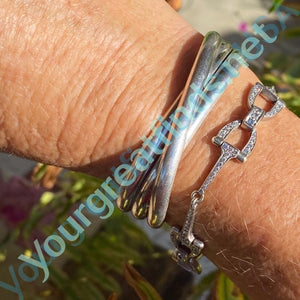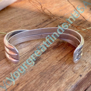 VIntage sterling silver triple cuff bracelet with one cross-over cuff. Interior measures 4 3/4" plus the opening of 1 1/2". The bracelet is 1/2" wide. Marked sterling. Weight: 41.2 grams. Has patina and shallow surface wear. Will polish up.