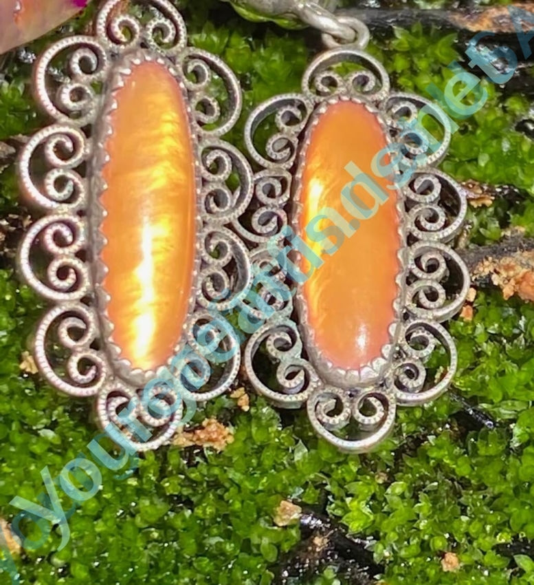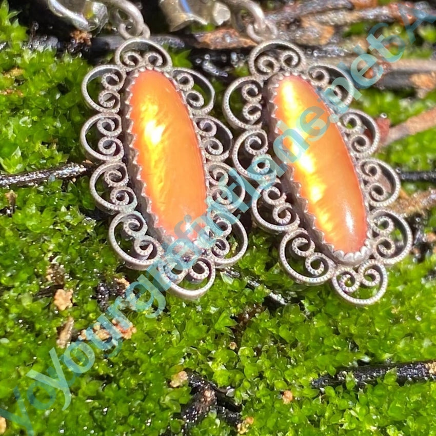 Vintage sterling silver filigree pierced earrings set with bright sunstone... that is very bright in the sun. They are 1" long. Total weight: 2.6 grams. Hallmarked on the back. Silver has some tarnish.