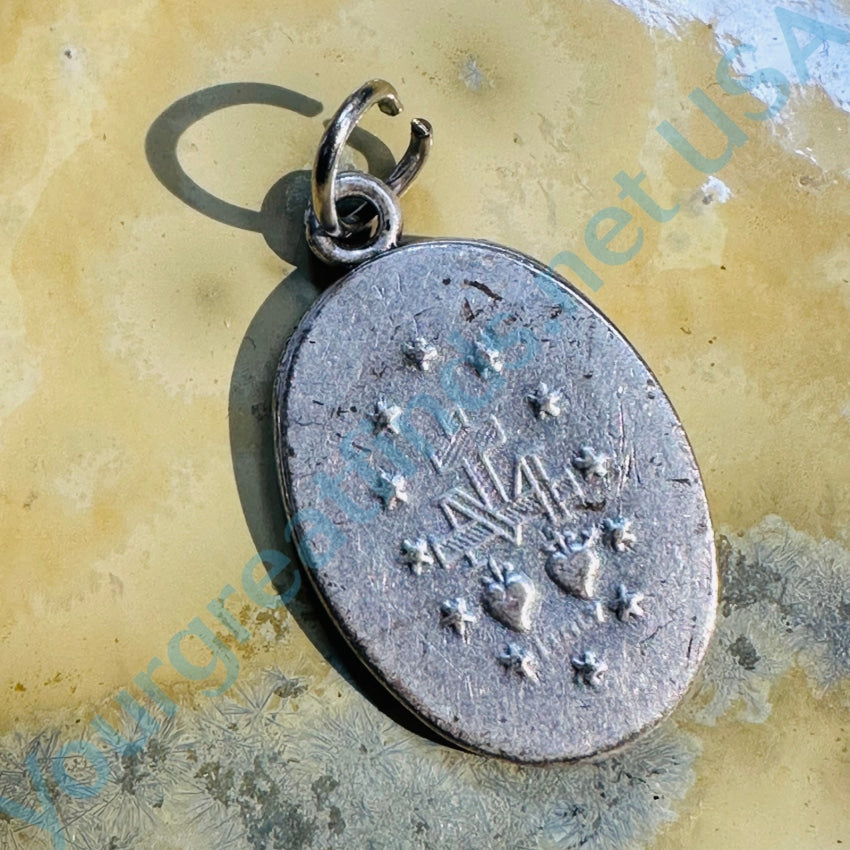 Vintage time worn Miraculous Mary Devotional pendant. Costume grade metal. 7/8” tall.