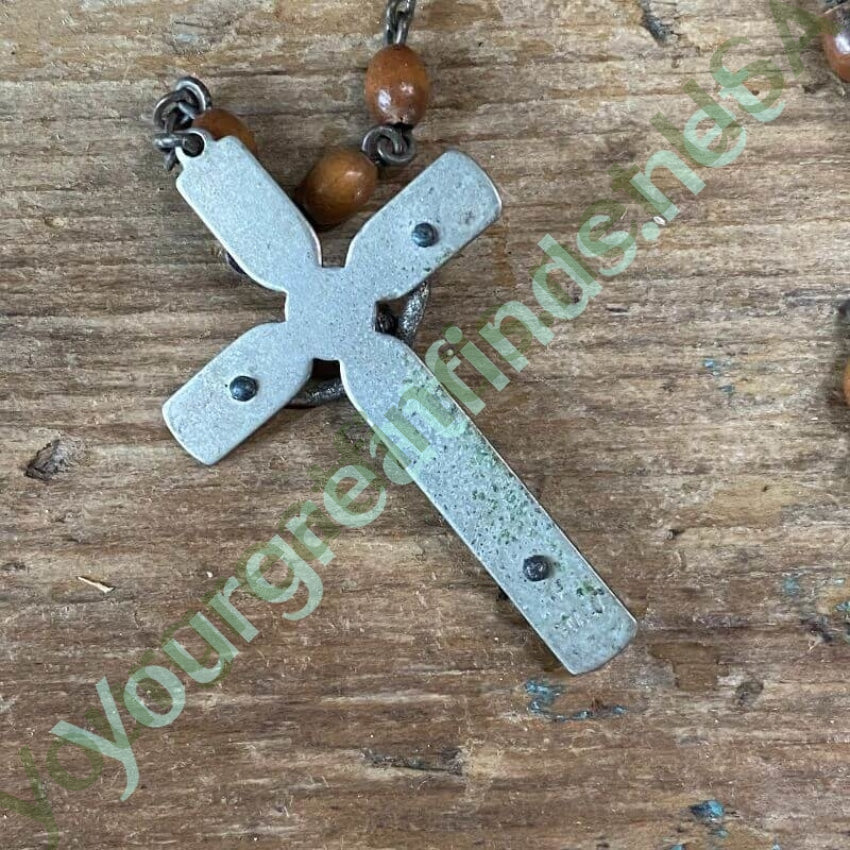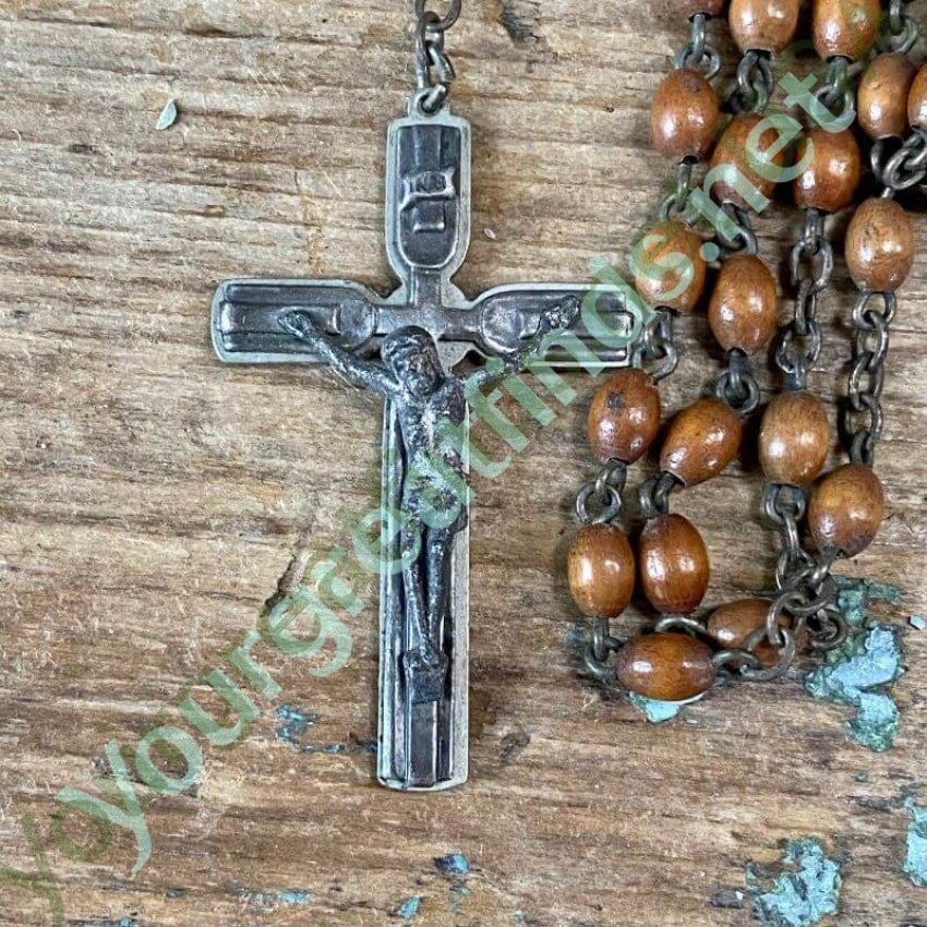 Vintage 1960s wooden bead rosary. The opening is 25" long. The front piece is 5" long. The crucifix is 1 3/4" long. The metal and the crucifix has a grungy tarnish from age.